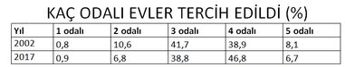 Ayrıca, 2002’de yüzde 42’yi bulan 3 odalı (salon dahil) evde yaşayan hanelerin oranı 2017 sonunda yüzde 38’lere indi. Aynı dönemde Türkiye genelinde 4 odalı evlerde yaşayan hanelerin toplama oranı ise 9 puan çıktı.