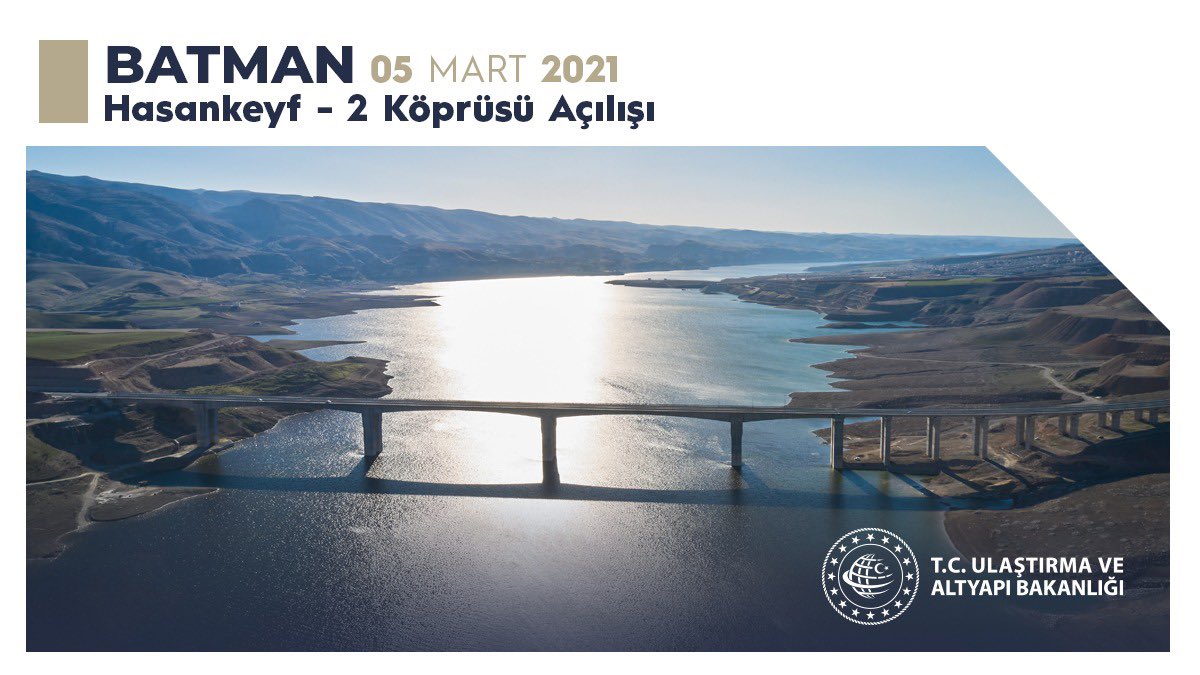 Ulaştırma ve Altyapı Bakanı Adil Karaismailoğlu, kişisel sosyal medya hesabından yaptığı paylaşımla Batman Hasankeyf – 2 Köprüsü’nün 5 mart 2021 cuma günü saat 14.30’da gerçekleştirilecek törenle hizmete gireceğini duyurdu.