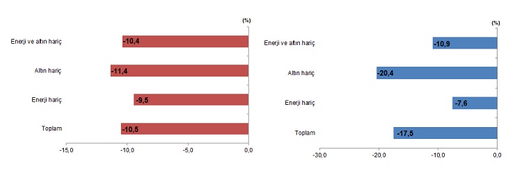 Haziran ayında enerji ürünleri ve parasal olmayan altın hariç ithalat %10,9 azalarak 22 milyar 272 milyon dolardan, 19 milyar 846 milyon dolara geriledi.