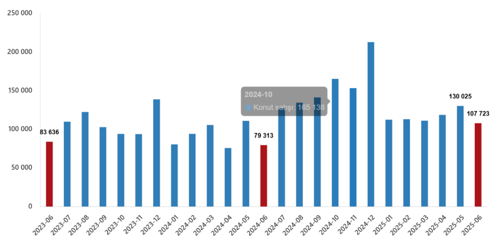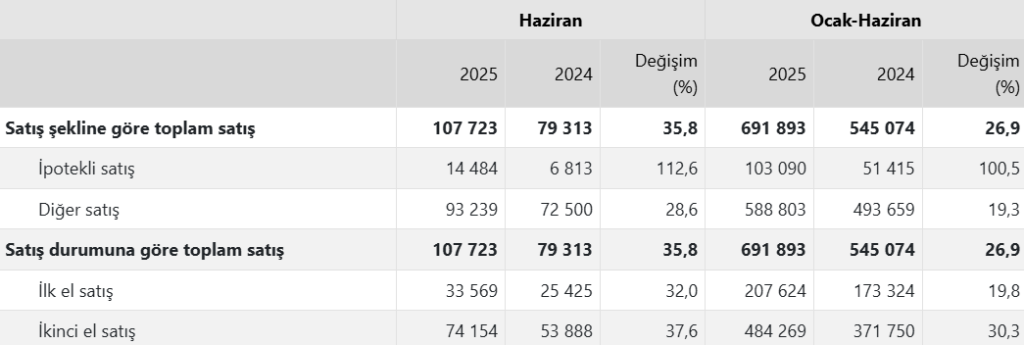 Türkiye İstatistik Kurumu (TÜİK) Haziran 2025 itibarıyla Konut Satış İstatistiklerini açıkladı. Buna göre, geçen yılın aynı dönemine göre yüzde 35.8 artan konut satış adetleri 107 bin 723 oldu.