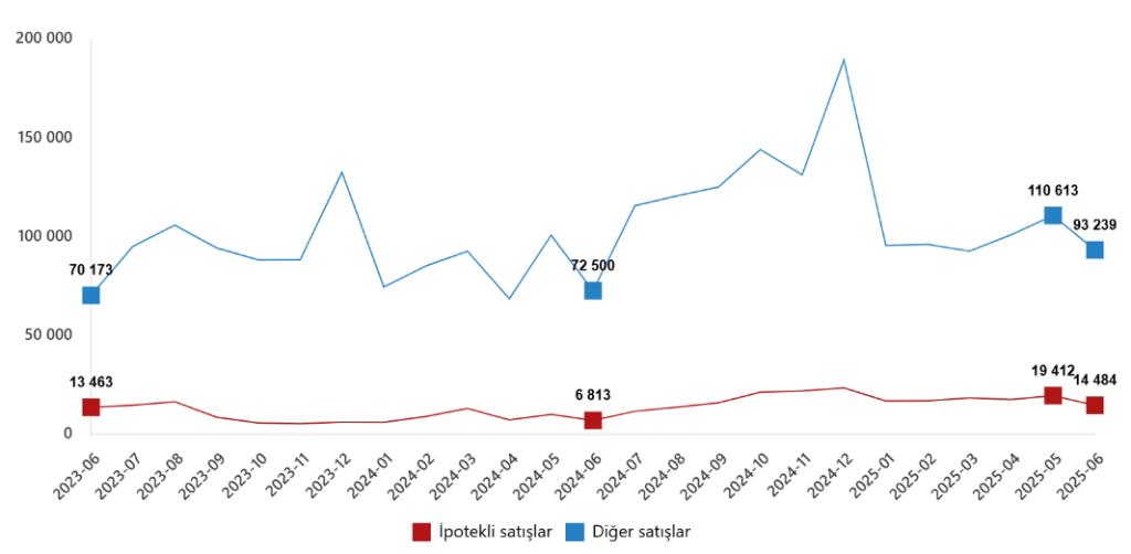 Türkiye genelinde ipotekli konut satışları Haziran ayında bir önceki yılın aynı ayına göre %112,6 oranında artarak 14 bin 484 oldu. Toplam konut satışları içinde ipotekli satışların payı %13,4 olarak gerçekleşti. Ocak-Haziran döneminde gerçekleşen ipotekli konut satışları ise bir önceki yılın aynı dönemine göre %100,5 oranında artarak 103 bin 90 oldu.
