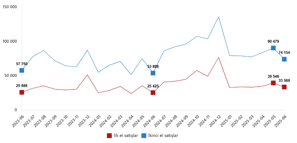 Türkiye genelinde ikinci el konut satış sayısı Haziran ayında bir önceki yılın aynı ayına göre %37,6 oranında artarak 74 bin 154 oldu. Toplam konut satışları içinde ikinci el konut satışının payı %68,8 oldu. İkinci el konut satışları Ocak-Haziran döneminde ise bir önceki yılın aynı dönemine göre %30,3 oranında artarak 484 bin 269 olarak gerçekleşti.