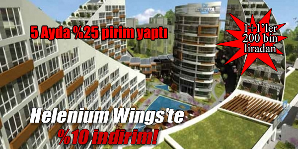Helenium Wings'te bayram özel kampanyası düzenlendi.Metrekare fiyatı 2.300-3.400 lira arası değişen projede stüdyo daireler tükendi. Projenin 1+1, 2+1 ve 3+1 dairelerinde ise fırsatlar devam ediyor.Projede %87 faiz oranı ve 60 aya kadar ödeme imkanı sunuluyor. Peşin alımlarda geçerli olacak %10’luk indirim tüm daire tiplerine uygulanırlen rezidans dairelere özel %12 indirim uygulanıyor.
