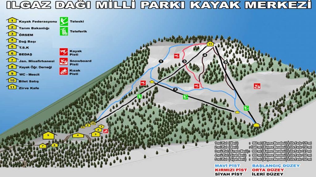 Dağda; başlangıç düzeyi, orta düzek ve ileri düzey kayak yapma zorluk derecesine sahip 800, 2 adet 900, 960 ve 1040 metre olmak üzere toplamda 5 pistte 4 bin 600 metrelik kayak ve snowboard yapma imkanı bulunuyor. Tesislerde saatte 1200 kişi taşıma kapasitesi bulunan bir adet telesiyej ile T-bar olarak ta isimlendirilen 2 adet teleski pist başlarına kayak yapanları taşıyor.