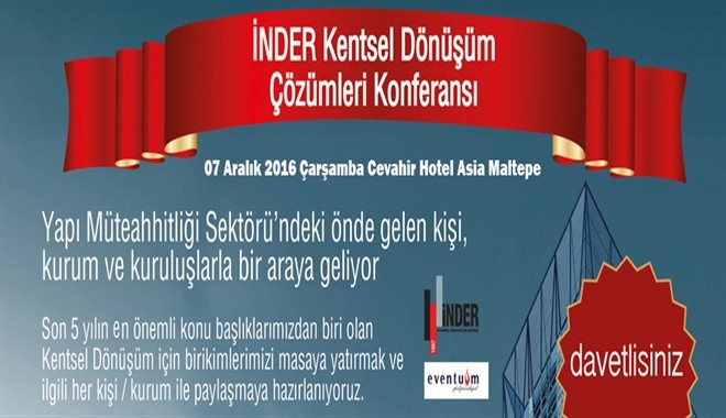 Yapı Müteahhitliği sektöründeki paydaşların bir araya toplayan İstanbul İnşaatçılar Derneği (İNDER), 07 Aralık 2016 Çarşamba günü saat 13.00’da Kentsel Dönüşüm Sürecindeki Çözümleri konuşacak.