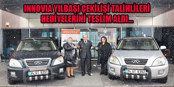 Müşterilerine daima kazandıran özel fırsatlar sunan Innovia, yılbaşı çekilişi ile kazanan talihlilere 1 adet Innovia 1. Etap’tan 1+1 daire, 2 adet Cherry Tiggo 4×4 otomobil, 5 adet Atv motor, 6 adet Samsung Smart LED TV ve 10 adet I Pad 2 hediye etmiş oldu.