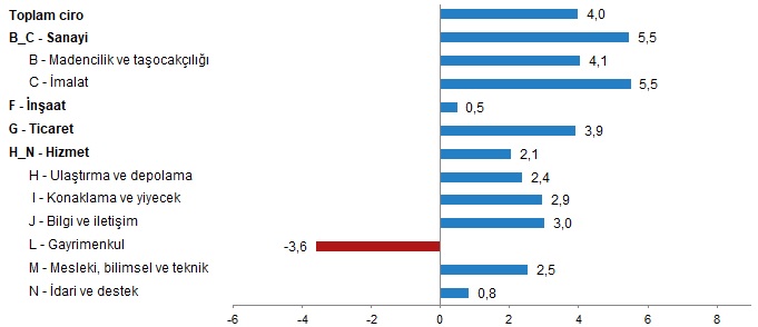 Toplam cironun alt detaylarına bakıldığında; 2021 yılı Ağustos ayında aylık sanayi sektörü ciro endeksi %5,5, inşaat ciro endeksi %0,5, ticaret ciro endeksi %3,9, hizmet ciro endeksi %2,1 arttı.