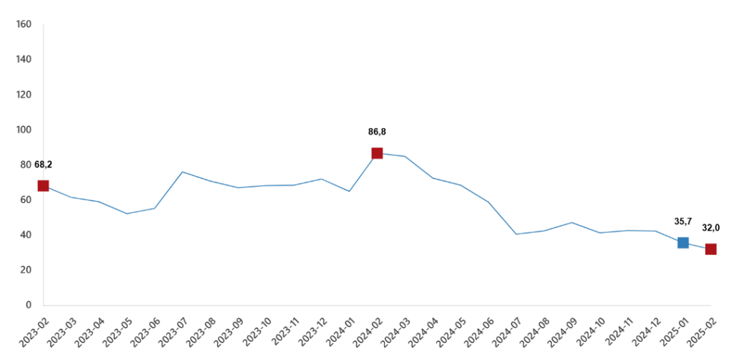 Toplam ciro yıllık değişim oranı(%), Şubat 2025