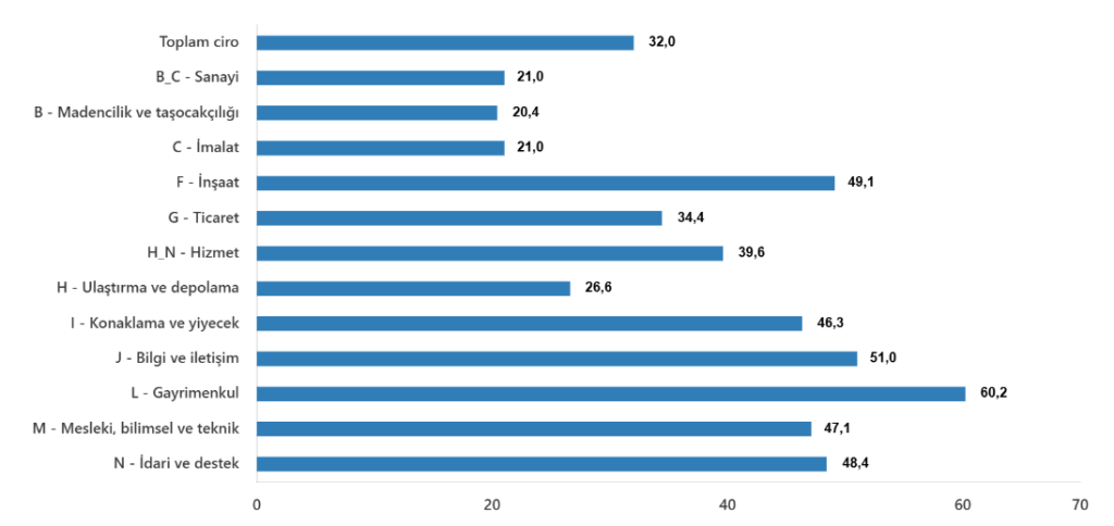 Toplam cironun alt detaylarına bakıldığında; 2025 yılı Şubat ayında yıllık sanayi sektörü ciro endeksi %21,0 arttı, inşaat ciro endeksi %49,1 arttı, ticaret ciro endeksi %34,4 arttı, hizmet ciro endeksi %39,6 arttı.