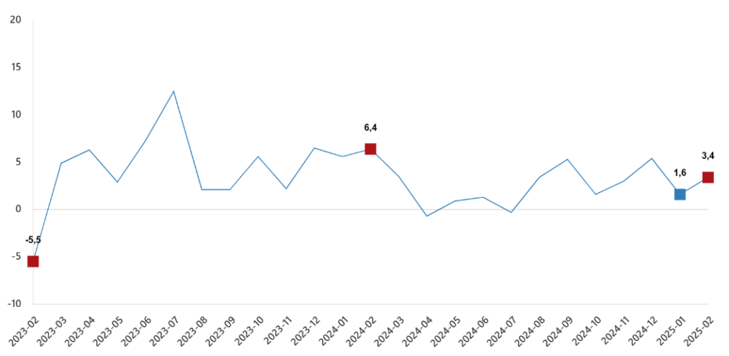 Sanayi, inşaat, ticaret ve hizmet sektörleri toplamında ciro endeksi (2021=100), 2025 yılı Şubat ayında aylık %3,4 arttı.