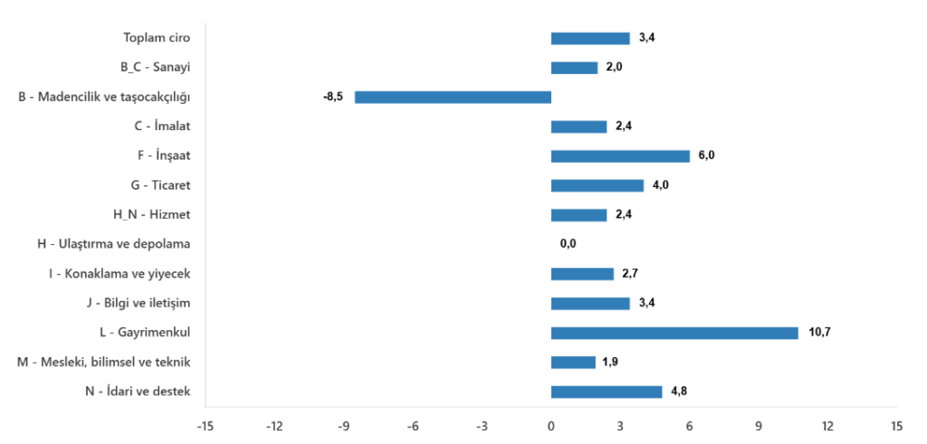 Toplam cironun alt detaylarına bakıldığında; 2025 yılı Şubat ayında aylık sanayi sektörü ciro endeksi %2,0 arttı, inşaat ciro endeksi %6,0 arttı, ticaret ciro endeksi %4,0 arttı, hizmet ciro endeksi %2,4 arttı.