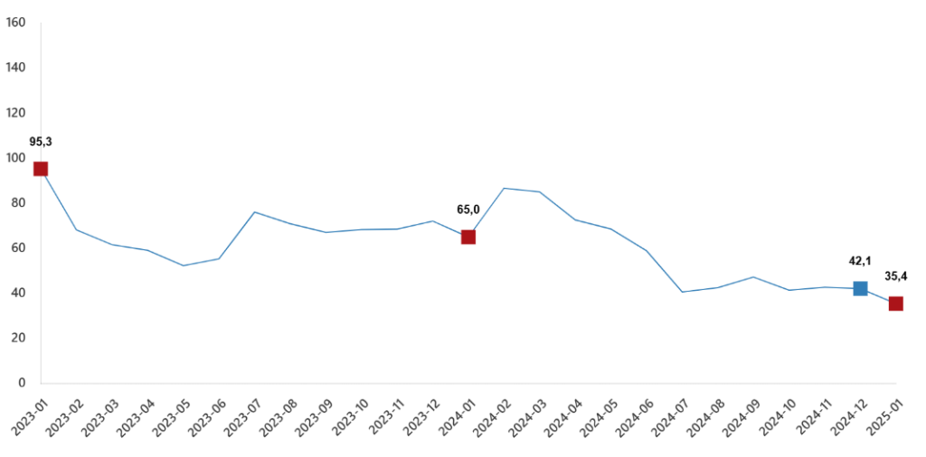 Sanayi, inşaat, ticaret ve hizmet sektörleri toplamında ciro endeksi (2021=100), 2025 yılı Ocak ayında yıllık %35,4 arttı.