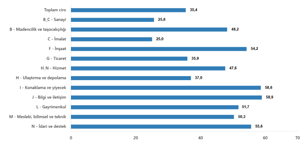 Toplam cironun alt detaylarına bakıldığında; 2025 yılı Ocak ayında yıllık sanayi sektörü ciro endeksi %25,6 arttı, inşaat ciro endeksi %54,2 arttı, ticaret ciro endeksi %35,9 arttı, hizmet ciro endeksi %47,6 arttı.