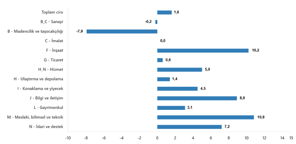 Toplam cironun alt detaylarına bakıldığında; 2025 yılı Ocak ayında aylık sanayi sektörü ciro endeksi %0,2 azaldı, inşaat ciro endeksi %10,2 arttı, ticaret ciro endeksi %0,6 arttı, hizmet ciro endeksi %5,0 arttı.