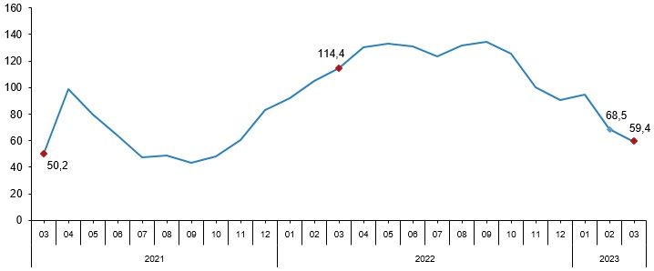 Sanayi, inşaat, ticaret ve hizmet sektörleri toplamında ciro endeksi (2015=100), 2023 yılı Mart ayında yıllık %59.4 arttı.