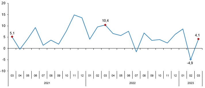 Sanayi, inşaat, ticaret ve hizmet sektörleri toplamında ciro endeksi (2015=100), 2023 yılı Mart ayında aylık %4.1 arttı.
