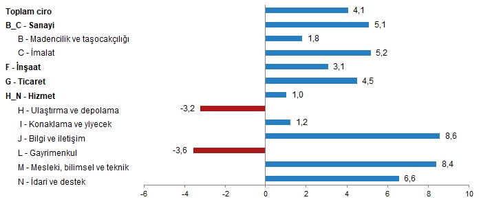 Toplam cironun alt detaylarına bakıldığında; 2023 yılı Mart ayında aylık sanayi sektörü ciro endeksi %5.1, inşaat ciro endeksi %3.1, ticaret ciro endeksi %4.5, hizmet ciro endeksi %1.0 arttı.