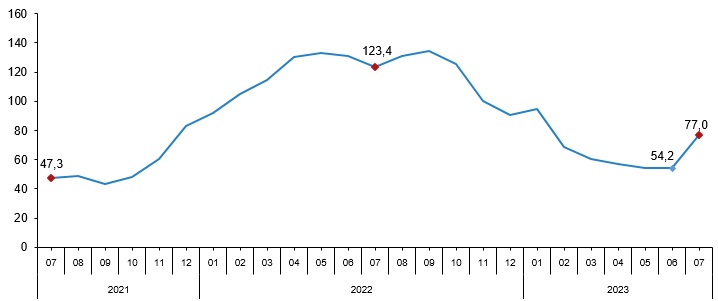 Sanayi, inşaat, ticaret ve hizmet sektörleri toplamında ciro endeksi (2015=100), 2023 yılı Temmuz ayında yıllık %77,0 arttı.