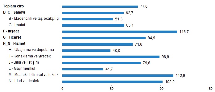 Türkiye İstatistik Kurumu (TÜİK), temmuz ayı itibarıyla Ciro Endeksleri verilerini açıkladı. Buna göre toplam ciro yıllık %77 artış kaydederken bu oran endeksin alt kırılımlarından inşaat sektöründe yüzde 116.7 olarak gerçekleşti.
