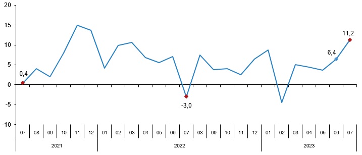 Sanayi, inşaat, ticaret ve hizmet sektörleri toplamında ciro endeksi (2015=100), 2023 yılı Temmuz ayında aylık %11,2 arttı.