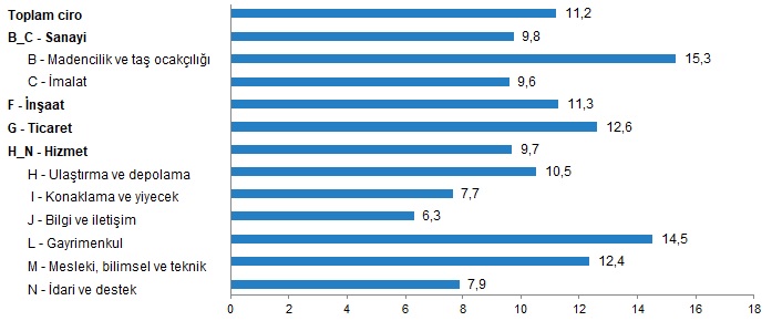 Toplam cironun alt detaylarına bakıldığında; 2023 yılı Temmuz ayında aylık sanayi sektörü ciro endeksi %9,8, inşaat ciro endeksi %11,3, ticaret ciro endeksi %12,6, hizmet ciro endeksi %9,7 arttı.