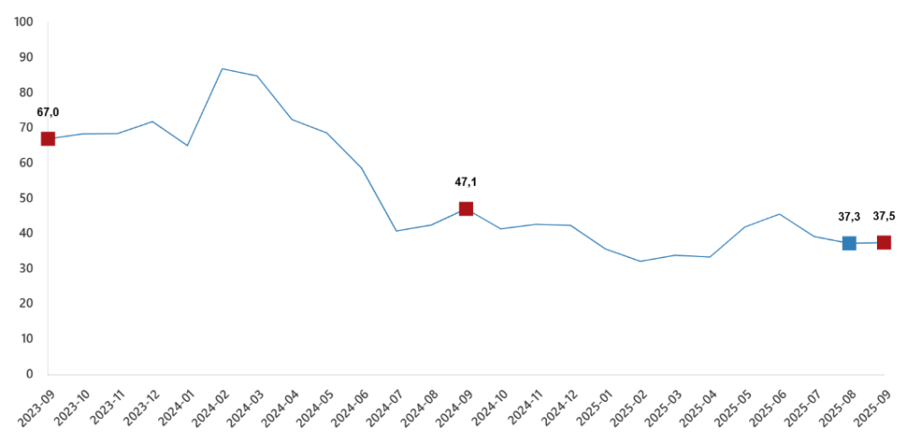 Sanayi, inşaat, ticaret ve hizmet sektörleri toplamında ciro endeksi (2021=100), 2025 yılı Eylül ayında yıllık %37,5 arttı.