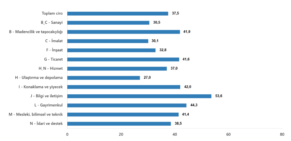 Toplam cironun alt detaylarına bakıldığında; 2025 yılı Eylül ayında yıllık sanayi sektörü ciro endeksi %30,5 arttı, inşaat ciro endeksi %32,8 arttı, ticaret ciro endeksi %41,6 arttı, hizmet ciro endeksi %37,0 arttı.