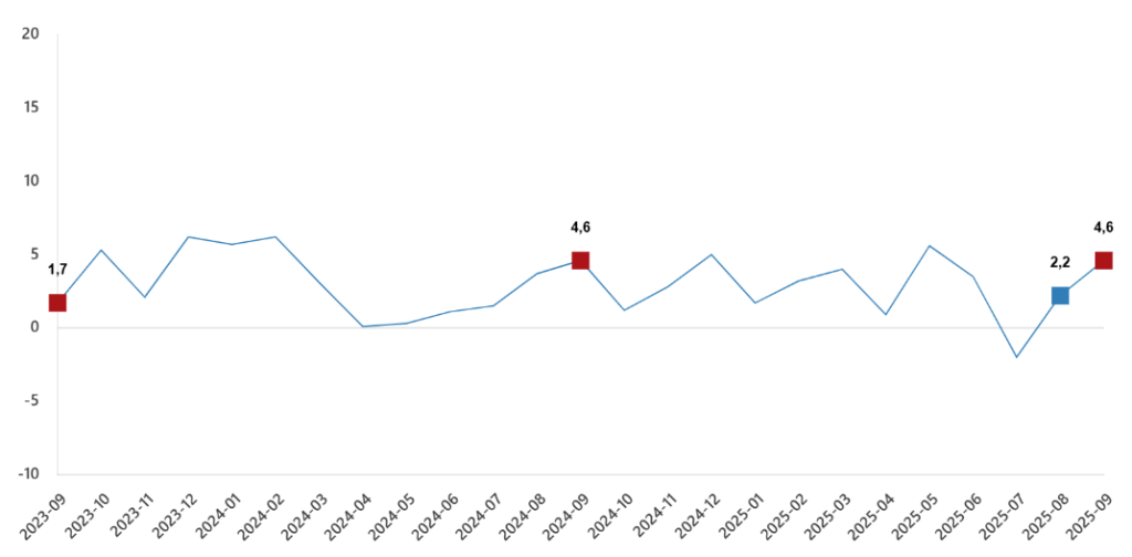Sanayi, inşaat, ticaret ve hizmet sektörleri toplamında ciro endeksi (2021=100), 2025 yılı Eylül ayında aylık %4,6 arttı.