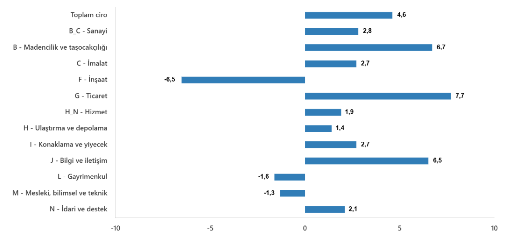 Toplam cironun alt detaylarına bakıldığında; 2025 yılı Eylül ayında aylık sanayi sektörü ciro endeksi %2,8 arttı, inşaat ciro endeksi %6,5 azaldı, ticaret ciro endeksi %7,7 arttı, hizmet ciro endeksi %1,9 arttı.