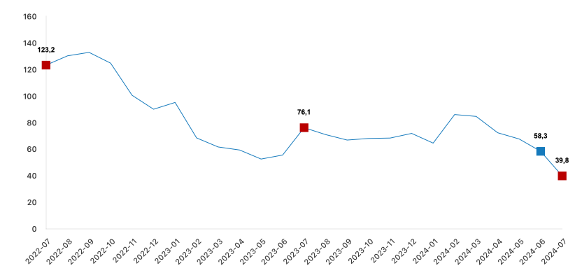 Sanayi, inşaat, ticaret ve hizmet sektörleri toplamında ciro endeksi (2021=100), 2024 yılı Temmuz ayında yıllık %39,8 arttı.