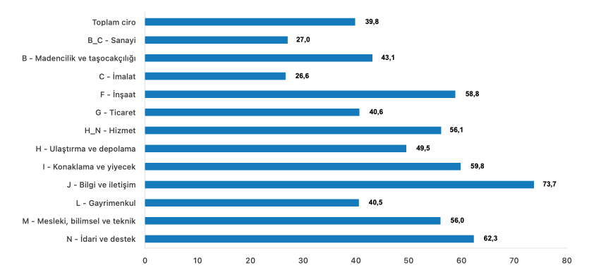 Toplam cironun alt detaylarına bakıldığında; 2024 yılı Temmuz ayında yıllık sanayi sektörü ciro endeksi %27,0 arttı, inşaat ciro endeksi %58,8 arttı, ticaret ciro endeksi %40,6 arttı, hizmet ciro endeksi %56,1 arttı.