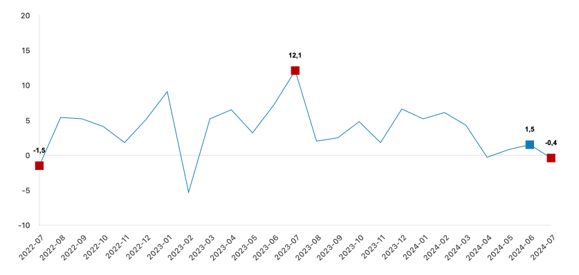 Sanayi, inşaat, ticaret ve hizmet sektörleri toplamında ciro endeksi (2021=100), 2024 yılı Temmuz ayında aylık %0,4 azaldı.