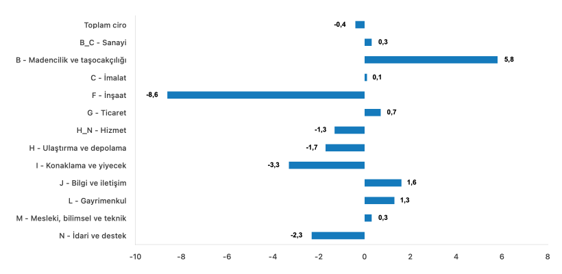 Toplam cironun alt detaylarına bakıldığında; 2024 yılı Temmuz ayında aylık sanayi sektörü ciro endeksi %0,3 arttı, inşaat ciro endeksi %8,6 azaldı, ticaret ciro endeksi %0,7 arttı, hizmet ciro endeksi %1,3 azaldı.