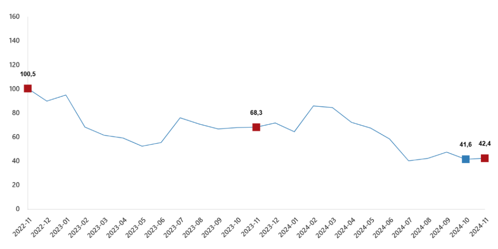 Sanayi, inşaat, ticaret ve hizmet sektörleri toplamında ciro endeksi (2021=100), 2024 yılı Kasım ayında yıllık %42,4 arttı.