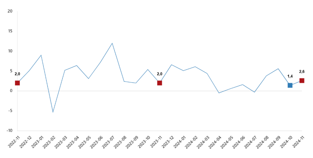 Sanayi, inşaat, ticaret ve hizmet sektörleri toplamında ciro endeksi (2021=100), 2024 yılı Kasım ayında aylık %2,6 arttı.