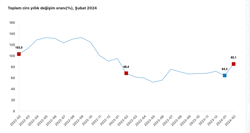 Sanayi, inşaat, ticaret ve hizmet sektörleri toplamında ciro endeksi (2021=100), 2024 yılı Şubat ayında yıllık %85,1 arttı.