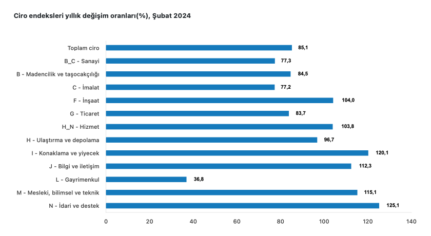 Toplam cironun alt detaylarına bakıldığında; 2024 yılı Şubat ayında yıllık sanayi sektörü ciro endeksi %77,3 arttı, inşaat ciro endeksi %104,0 arttı, ticaret ciro endeksi %83,7 arttı, hizmet ciro endeksi %103,8 arttı.