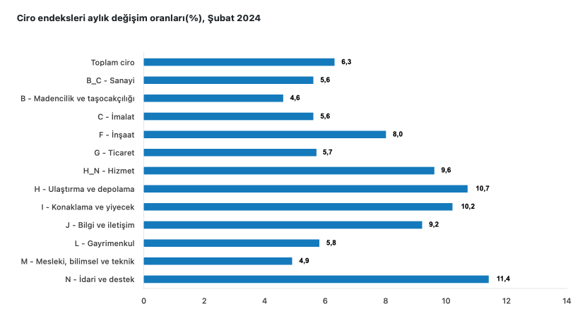 Toplam cironun alt detaylarına bakıldığında; 2024 yılı Şubat ayında aylık sanayi sektörü ciro endeksi %5,6 arttı, inşaat ciro endeksi %8,0 arttı, ticaret ciro endeksi %5,7 arttı, hizmet ciro endeksi %9,6 arttı.