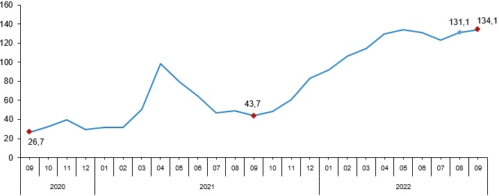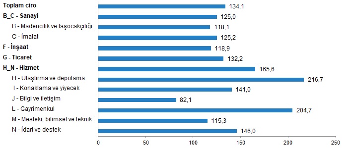 Sanayi, inşaat, ticaret ve hizmet sektörleri toplamında ciro endeksi (2015=100), 2022 yılı Eylül ayında yıllık %134,1 arttı.