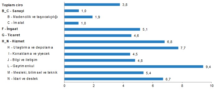 Toplam cironun alt detaylarına bakıldığında; 2022 yılı Eylül ayında aylık sanayi sektörü ciro endeksi %1,0, inşaat ciro endeksi %5,1, ticaret ciro endeksi %4,6, hizmet ciro endeksi %6,8 arttı.