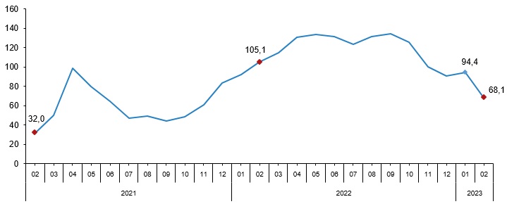 Sanayi, inşaat, ticaret ve hizmet sektörleri toplamında ciro endeksi (2015=100), 2023 yılı Şubat ayında yıllık %68,1 arttı.