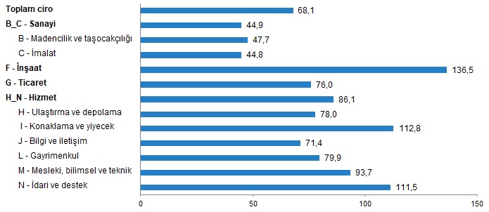 Türkiye İstatistik Kurumu (TÜİK), Şubat 2023 itibarıyla Ciro Endekslerini açıkladı. Buna göre, toplam ciro yıllık bazda yüzde 68.1 artarken bu oran endeksin alt kırılımlarından inşaat sektöründe yüzde 136.5 olarak gerçekleşti.