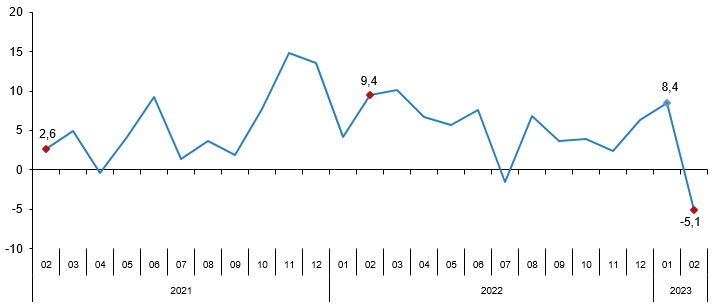 Sanayi, inşaat, ticaret ve hizmet sektörleri toplamında ciro endeksi (2015=100), 2023 yılı Şubat ayında aylık %5,1 azaldı.