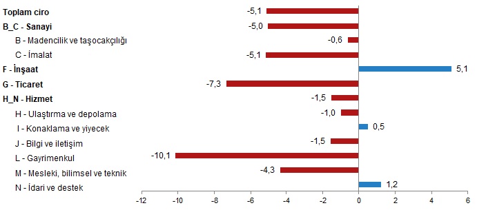 Toplam cironun alt detaylarına bakıldığında; 2023 yılı Şubat ayında aylık inşaat ciro endeksi %5,1 artarken, sanayi sektörü ciro endeksi %5,0, ticaret ciro endeksi %7,3, hizmet ciro endeksi %1,5 azaldı.