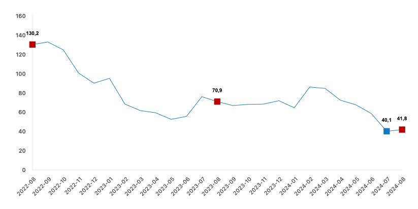 Sanayi, inşaat, ticaret ve hizmet sektörleri toplamında ciro endeksi (2021=100), 2024 yılı Ağustos ayında yıllık %41,8 arttı.