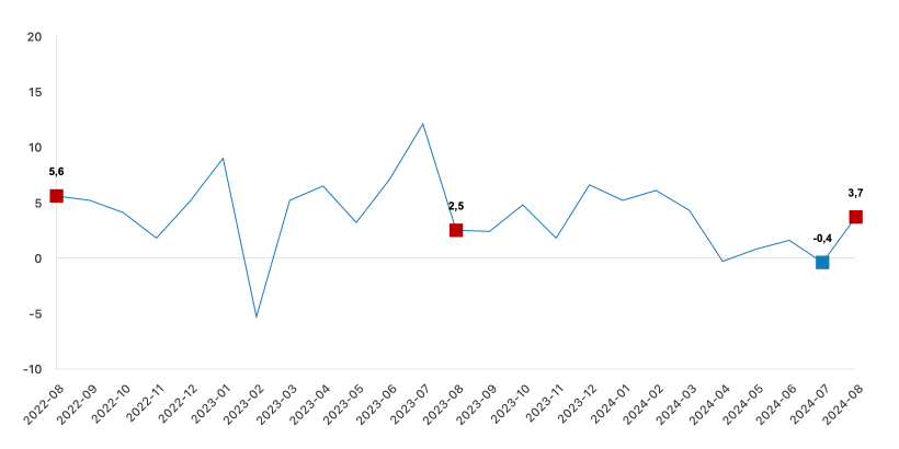 Sanayi, inşaat, ticaret ve hizmet sektörleri toplamında ciro endeksi (2021=100), 2024 yılı Ağustos ayında aylık %3,7 arttı.