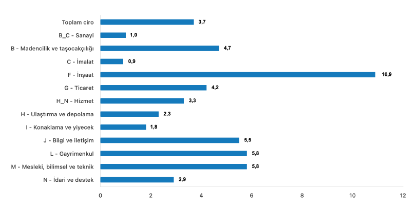 Toplam cironun alt detaylarına bakıldığında; 2024 yılı Ağustos ayında aylık sanayi sektörü ciro endeksi %1,0 arttı, inşaat ciro endeksi %10,9 arttı, ticaret ciro endeksi %4,2 arttı, hizmet ciro endeksi %3,3 arttı.