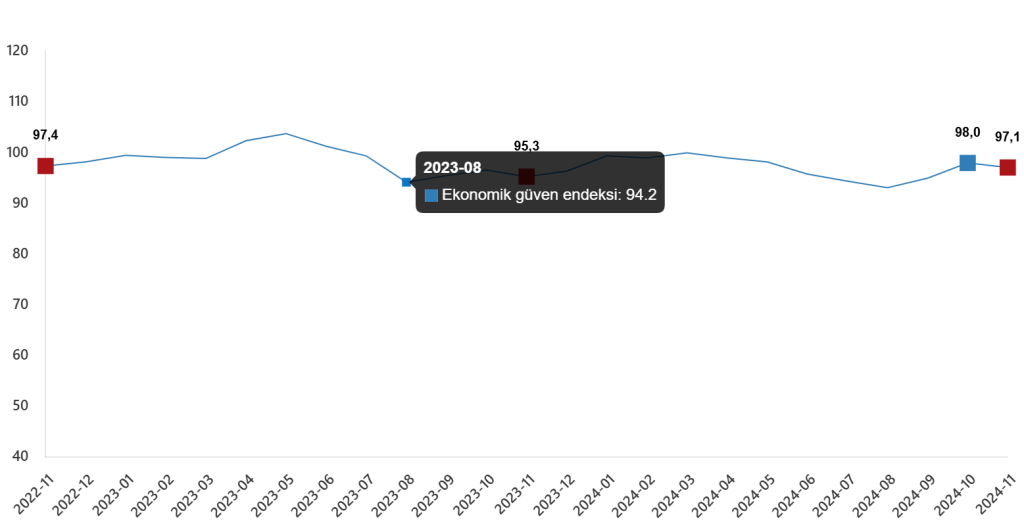 Ekonomik güven endeksi Ekim ayında 98,0 iken, Kasım ayında %0,9 oranında azalarak 97,1 değerini aldı.