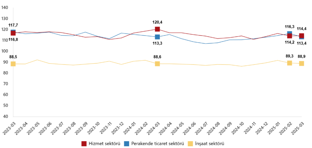 Mevsim etkilerinden arındırılmış güven endeksi Mart ayında bir önceki aya göre; hizmet sektöründe %0,2 oranında artarak 114,4 değerini, perakende ticaret sektöründe %2,5 oranında azalarak 113,4 değerini ve inşaat sektöründe %0,5 oranında azalarak 88,9 değerini aldı.