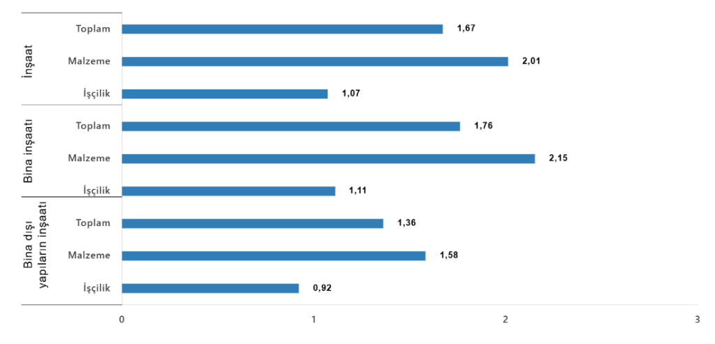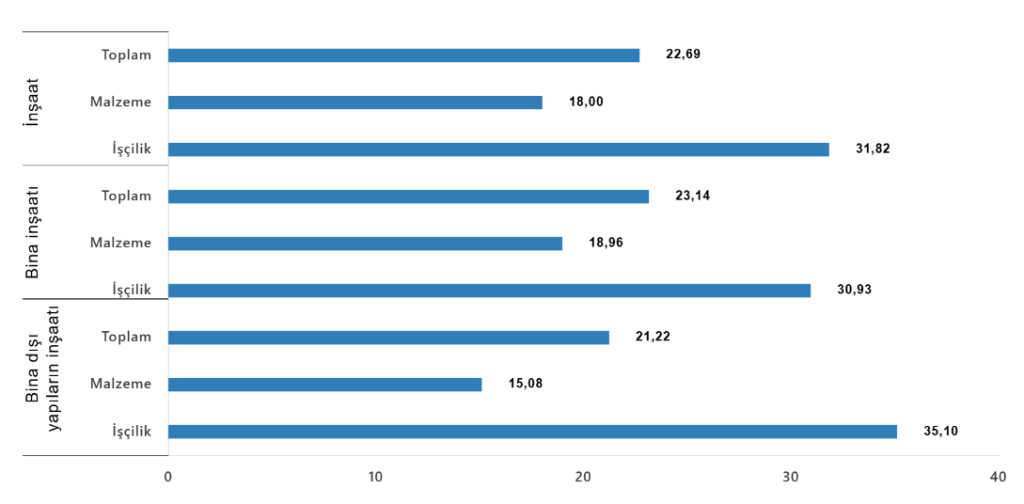 Bina inşaatı maliyet endeksi, bir önceki aya göre %1,76 arttı, bir önceki yılın aynı ayına göre %23,14 arttı. Bir önceki aya göre malzeme endeksi %2,15 arttı, işçilik endeksi %1,11 arttı. Ayrıca bir önceki yılın aynı ayına göre malzeme endeksi %18,96 arttı, işçilik endeksi %30,93 arttı.
